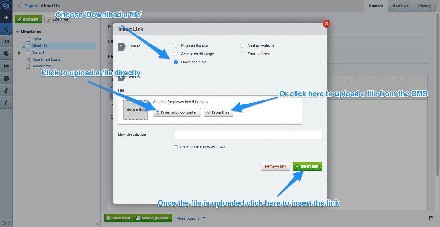 From the "link to" step (1) choose "Download a file" from the list of options. Click 'From files' to link a document from the CMS or 'From your computer' to directly upload and link a document.