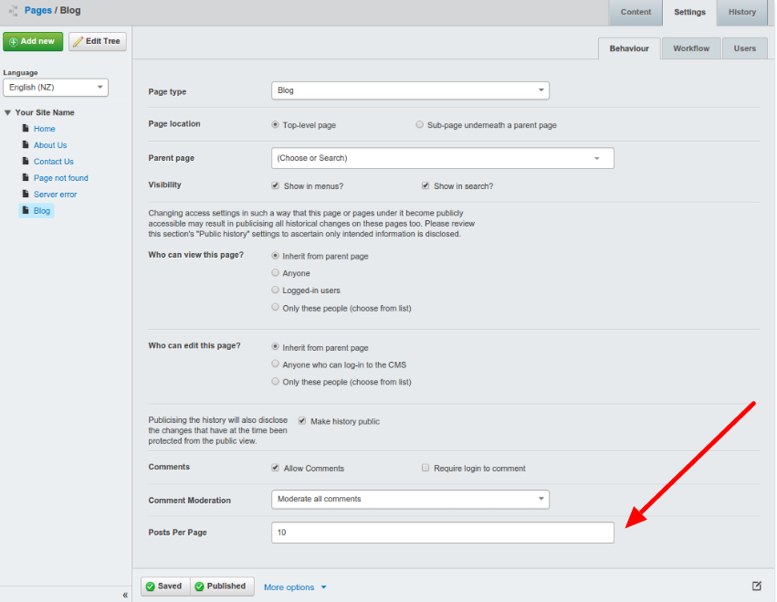 By default your Blog will display ten posts per page. The number of posts per page is configurable via the "Settings" tab. Setting posts per page to zero will disable pagination, displaying all of your posts on a single page.