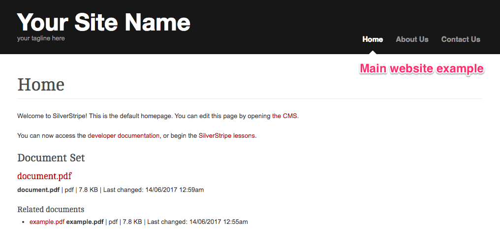 The "Related documents" tab allows you to link related documents to a document. Related documents will be displayed in a list underneath the main document when viewing the associated page on your website. This example shows "document.pdf" with its related document "example.pdf".