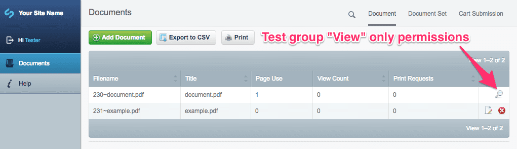 You can set various permissions for different user groups under the "Permissions" tab such as "Who can view this document?" and "Who can edit this document?". For example, if the group "Test group" is able to view but not edit a document, the group will see a magnifying glass icon to only view uneditable information of that particular document. When viewing the main website, only users logged in and belonging to the "Test group" will be able to see the document.