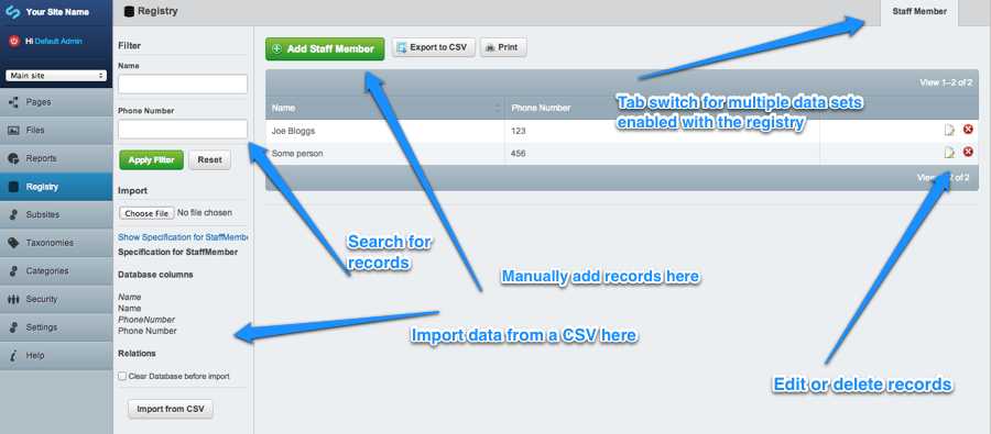 SilverStripe CMS websites can publish data held in their databases for users to access (alongside traditional web pages). For example, you might publish a database of all of the schools in the country, or a registry of people holding a qualification, so that website visitors can find information they seek.
