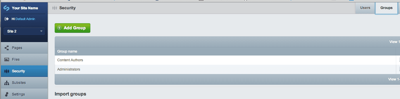 Once you make a selection from the dropdown, you see the appropriate groups in the Security section. In the Security section, click a group and go to its Subsites tab to assign the subsites to which the group has access. Click Only these subsites to reveal a checklist of all available sites.