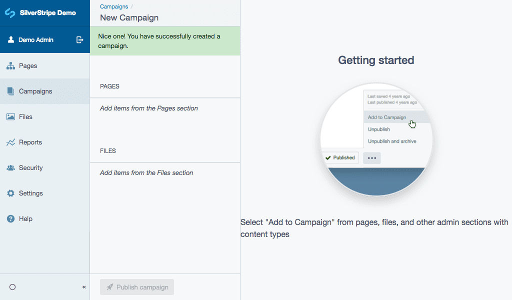 By selecting a campaign you will be taken to a view where you can see the contents of that campaign. These items will be categorised by content type (for example pages and files).