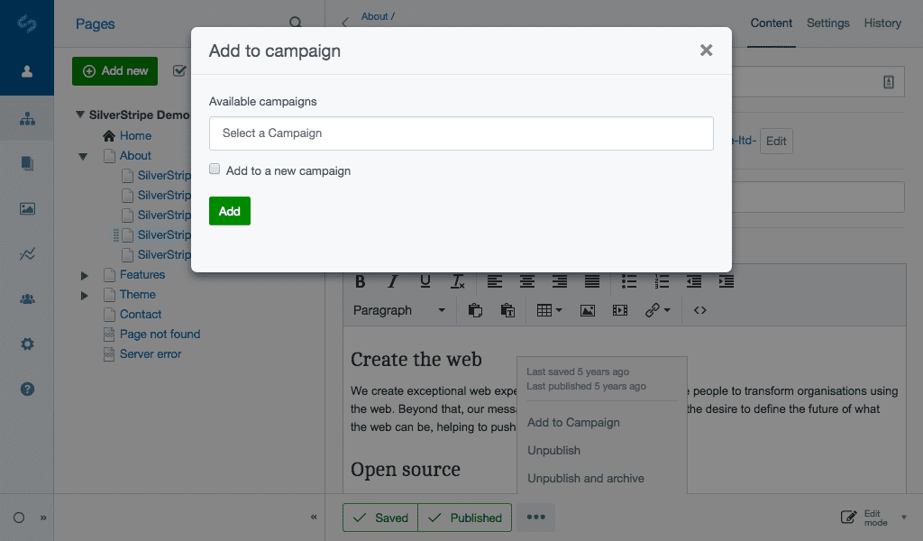 - By clicking on the Add to campaign action you will be presented with a dialog which will allow you to choose which campaign the content should be added to.