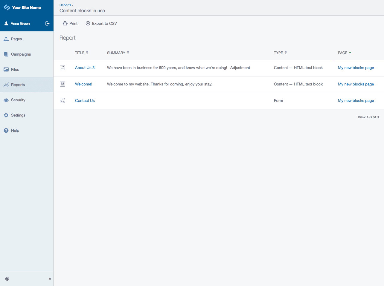 The Elemental module will add new reports to the Reports section of the CMS. These will allow you to identify and find content within blocks quickly.