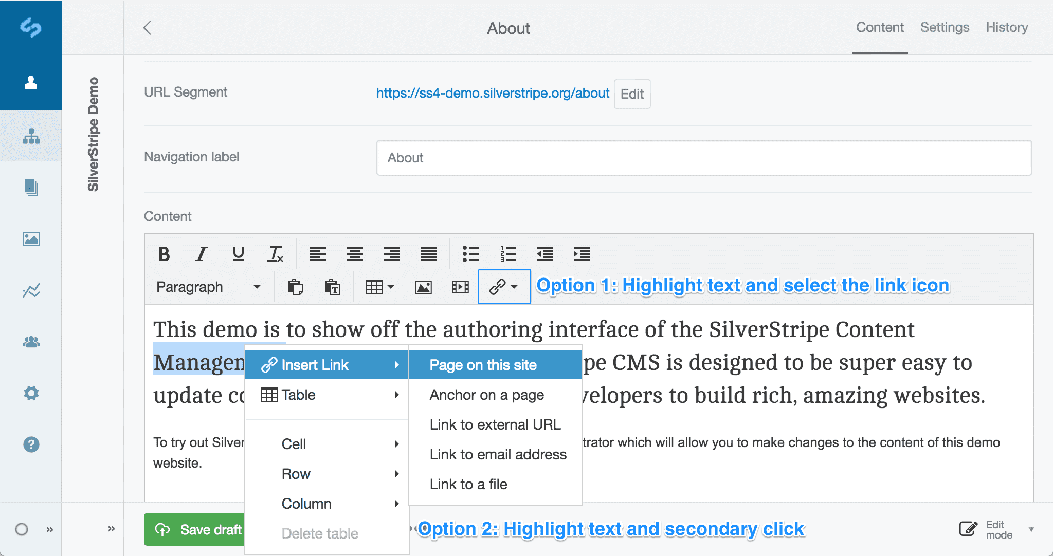 - Navigate to the Pages section within the CMS menu and select the page you want to add a hyperlink to in the site tree.